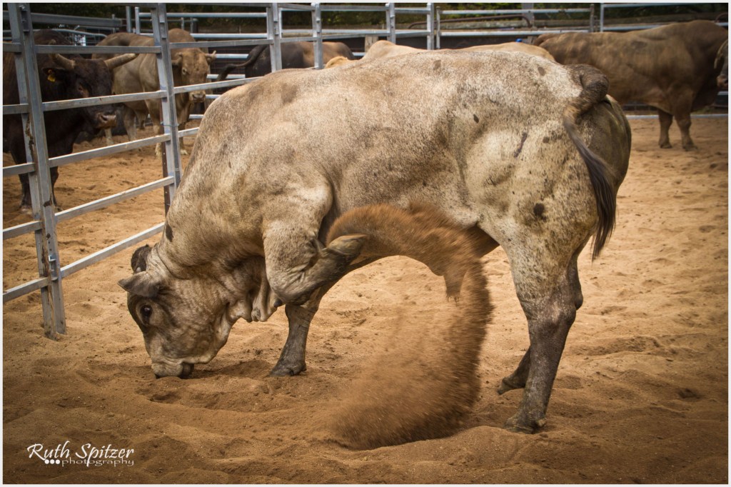 Everywhere you look and walk, it’s a sensory overload, from horses warming up in the paddock to enormous bulls mating in the pens or stomping restlessly about, heaving their weight against the bars, watching you with determined eyes that you’re so mesmerized, you can barely tear yourself away, you’re drawn closer to the bars, oblivious to the danger that lurks in the blink of an eye. But such a magnificent animal in the flesh. Standing about 2 feet away, hard to imagine, the only thing protecting you against this larger than life force are a few bars of steel.
