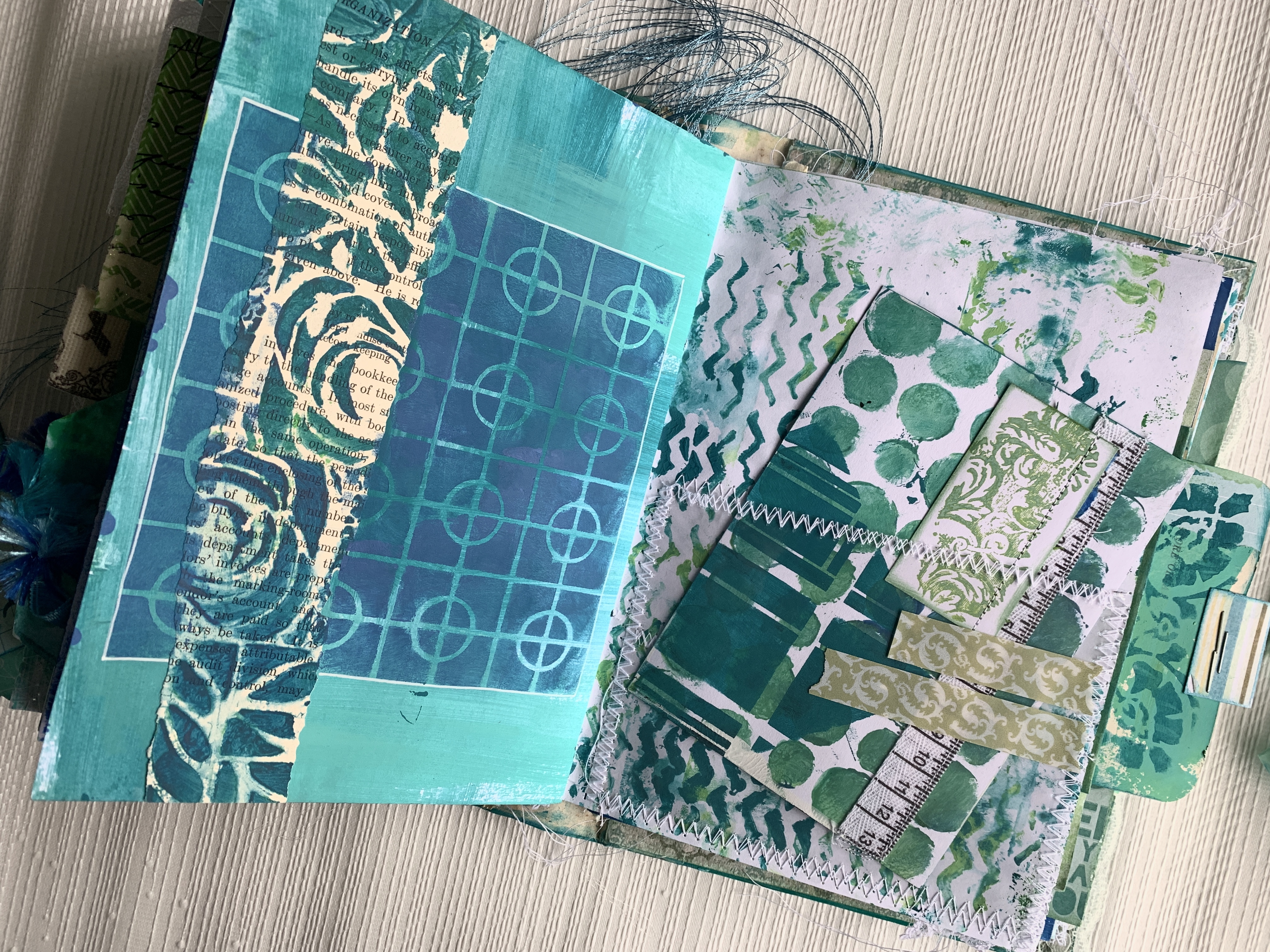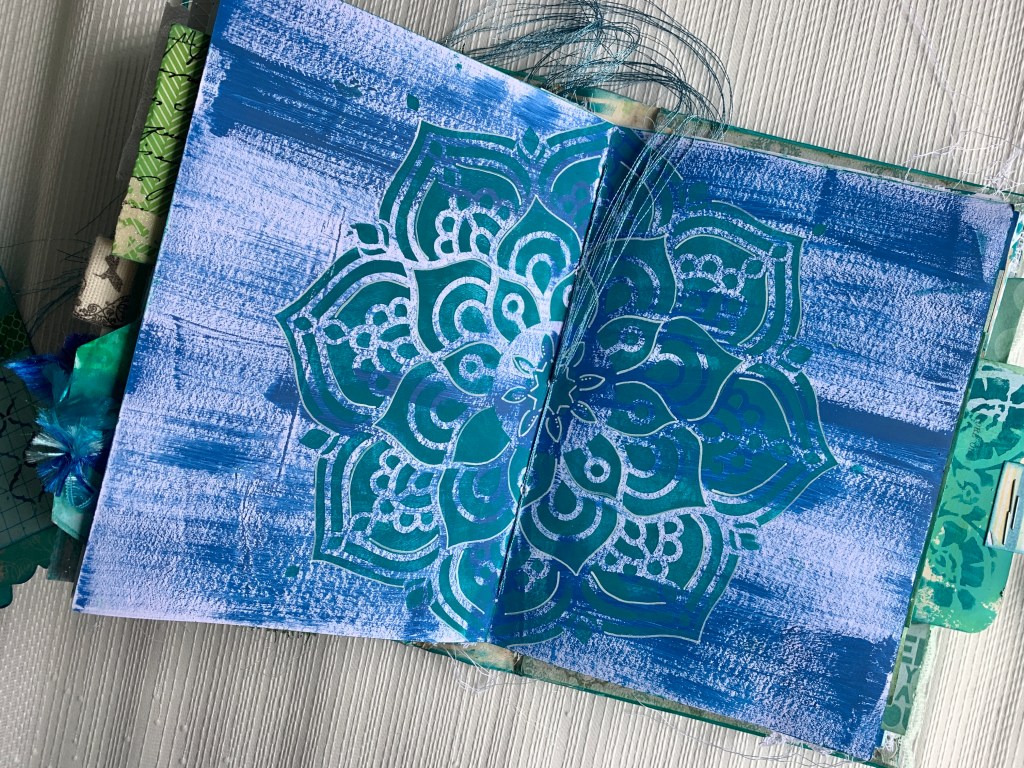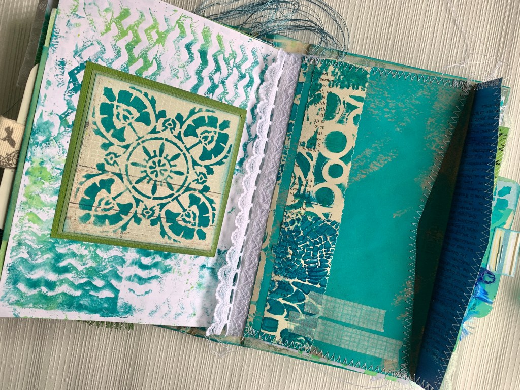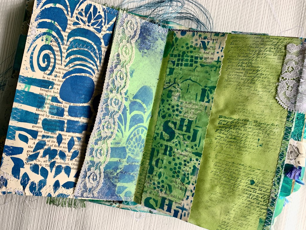 Front and Back covers are an existing vintage book with internal pages removed and cover decorated with acrylic paint and stencils.