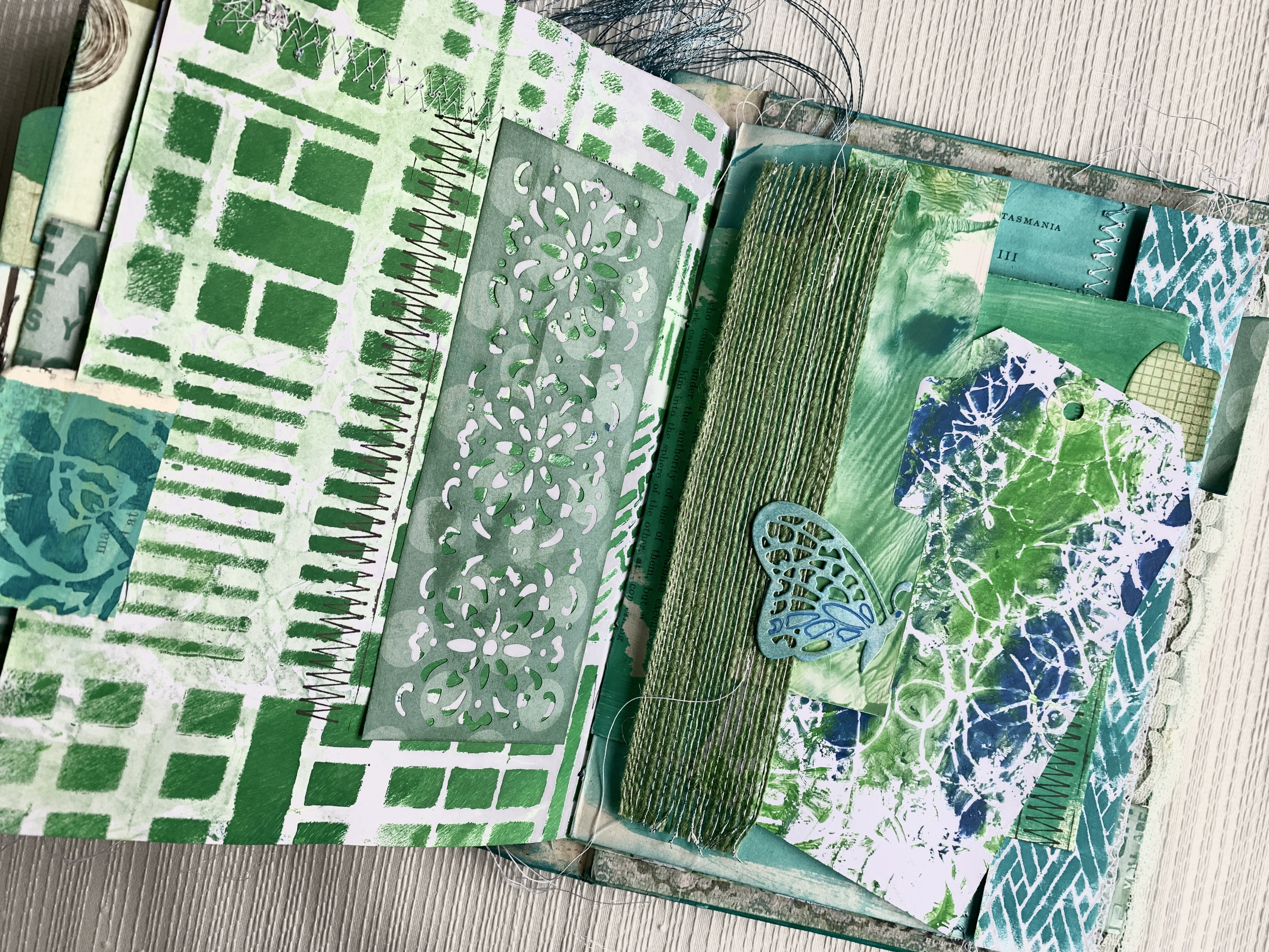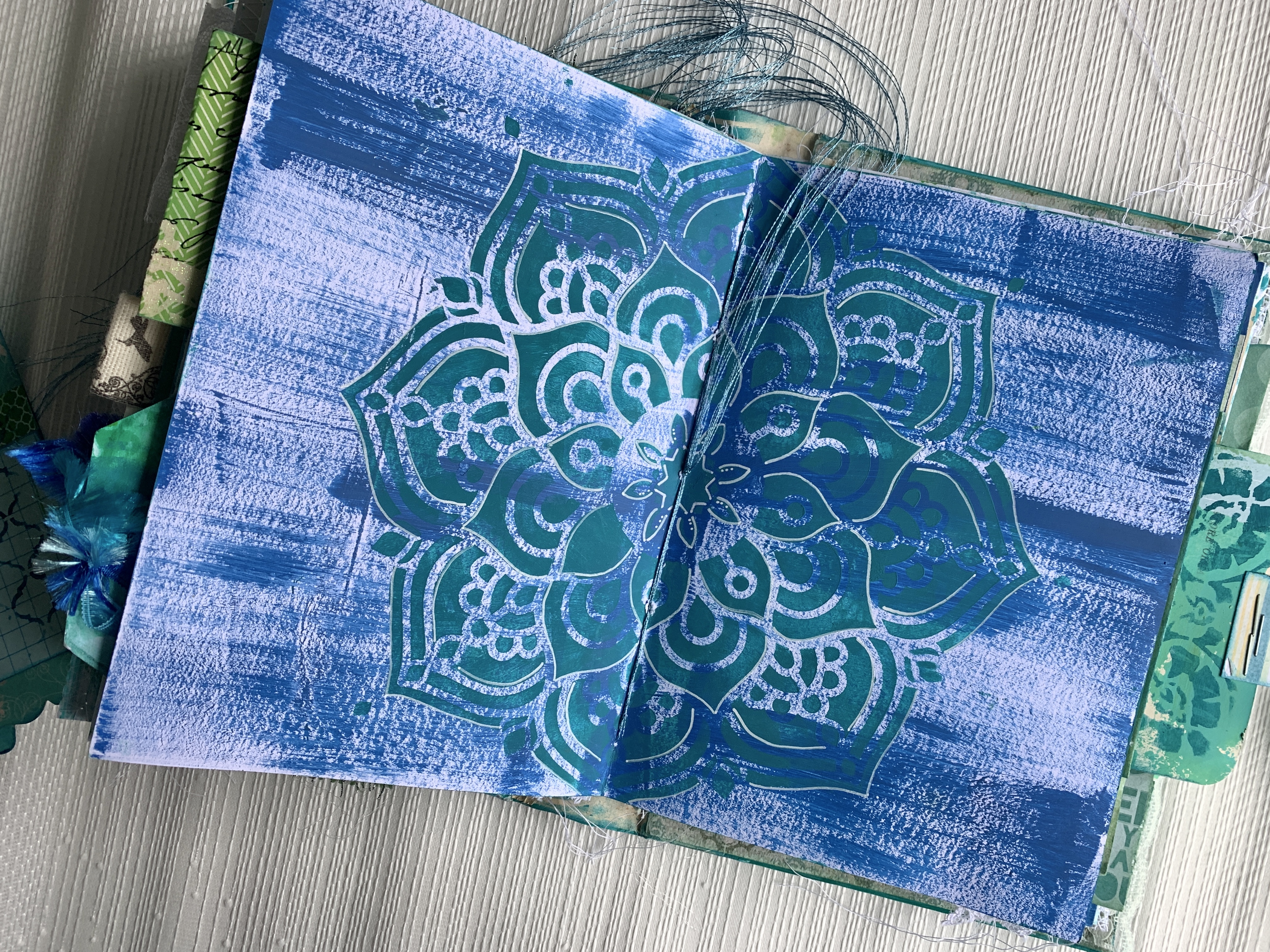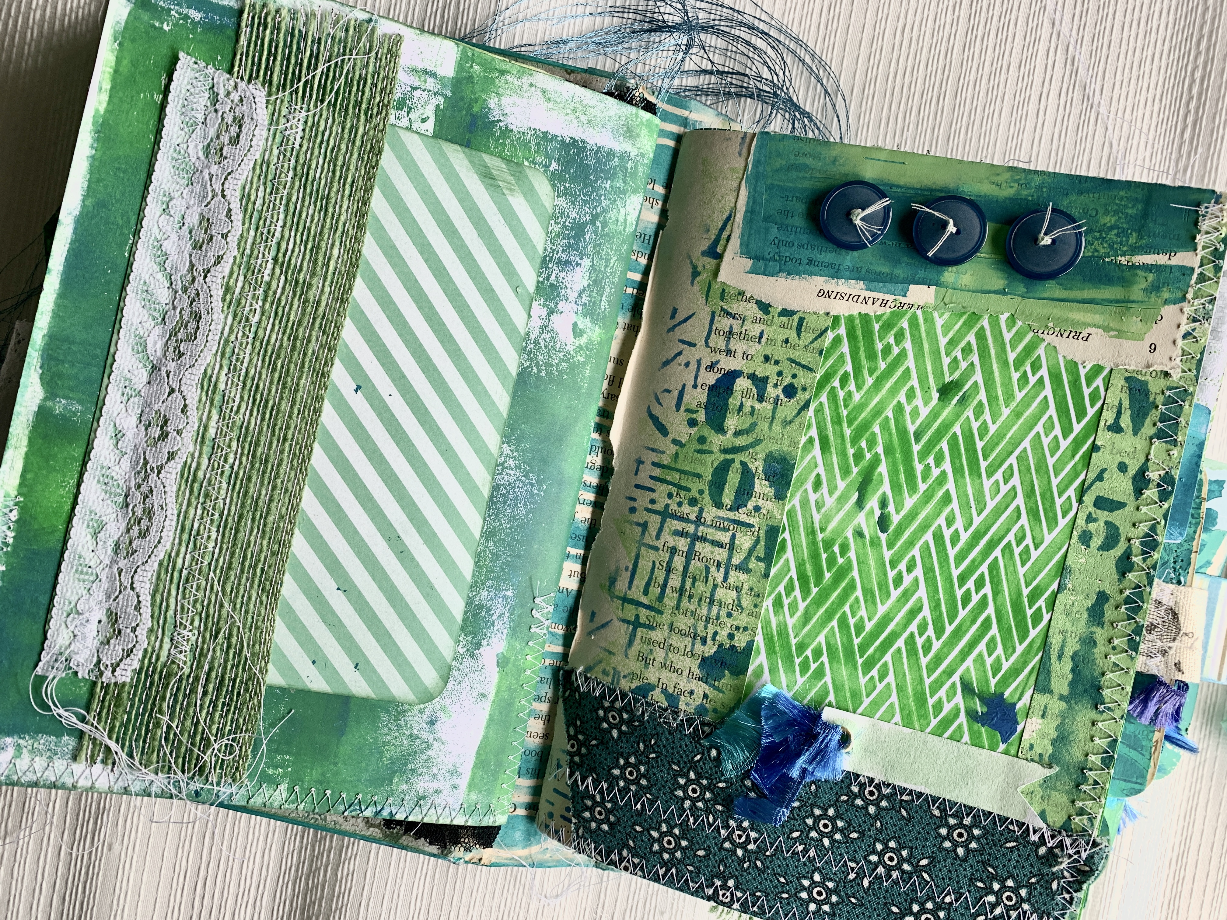 Front and Back covers are an existing vintage book with internal pages removed and cover decorated with acrylic paint and stencils.
