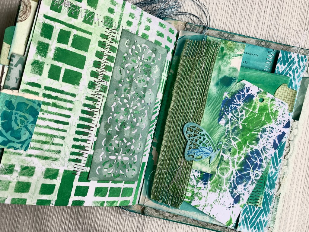 At the end of this messy enjoyable painted process, four signatures were created and bound into an old vintage book, where I’d removed the internal pages, kept the cover and decorated it with paint and stencils.